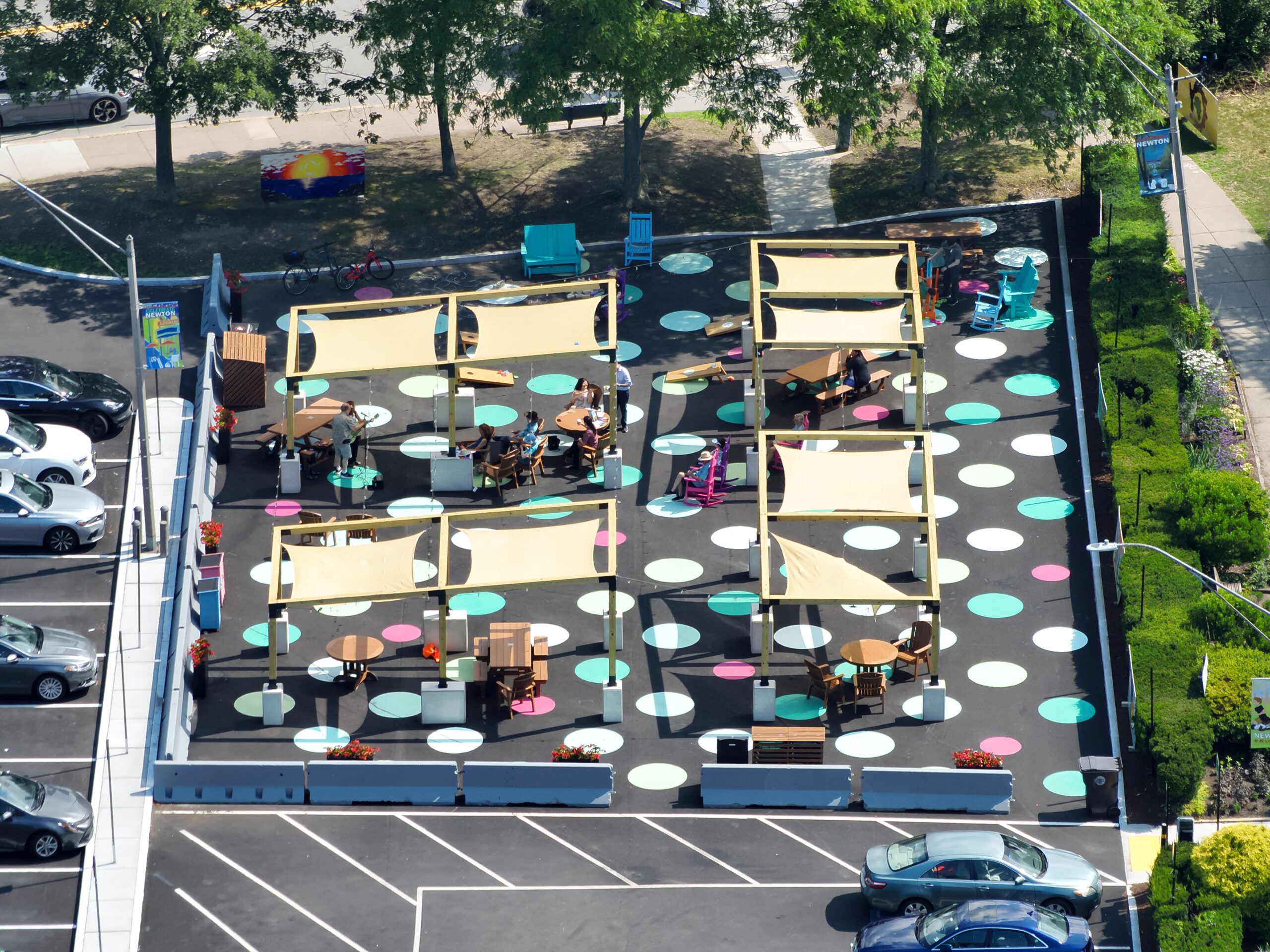DREAM designed and implemented a quick-build âtactical urbanismâ pilot project converting a 7,000 sf portion of a municipal parking lot in Newton Centre into an inviting, people-focused gathering space. The City had four clear goals for the space: foster areas of play, create vibrancy by incorporating public art, promote safety and separation from cars, and provide comfortable seating.